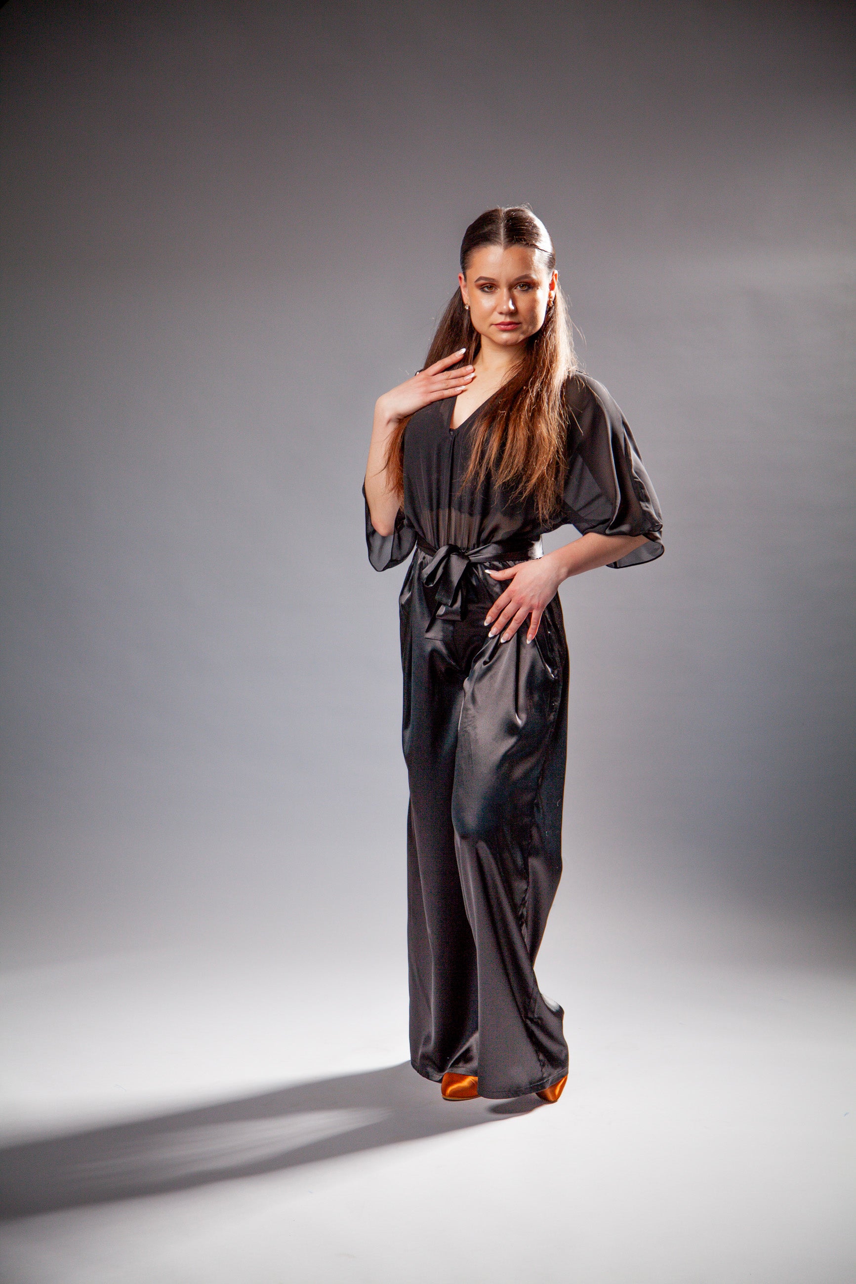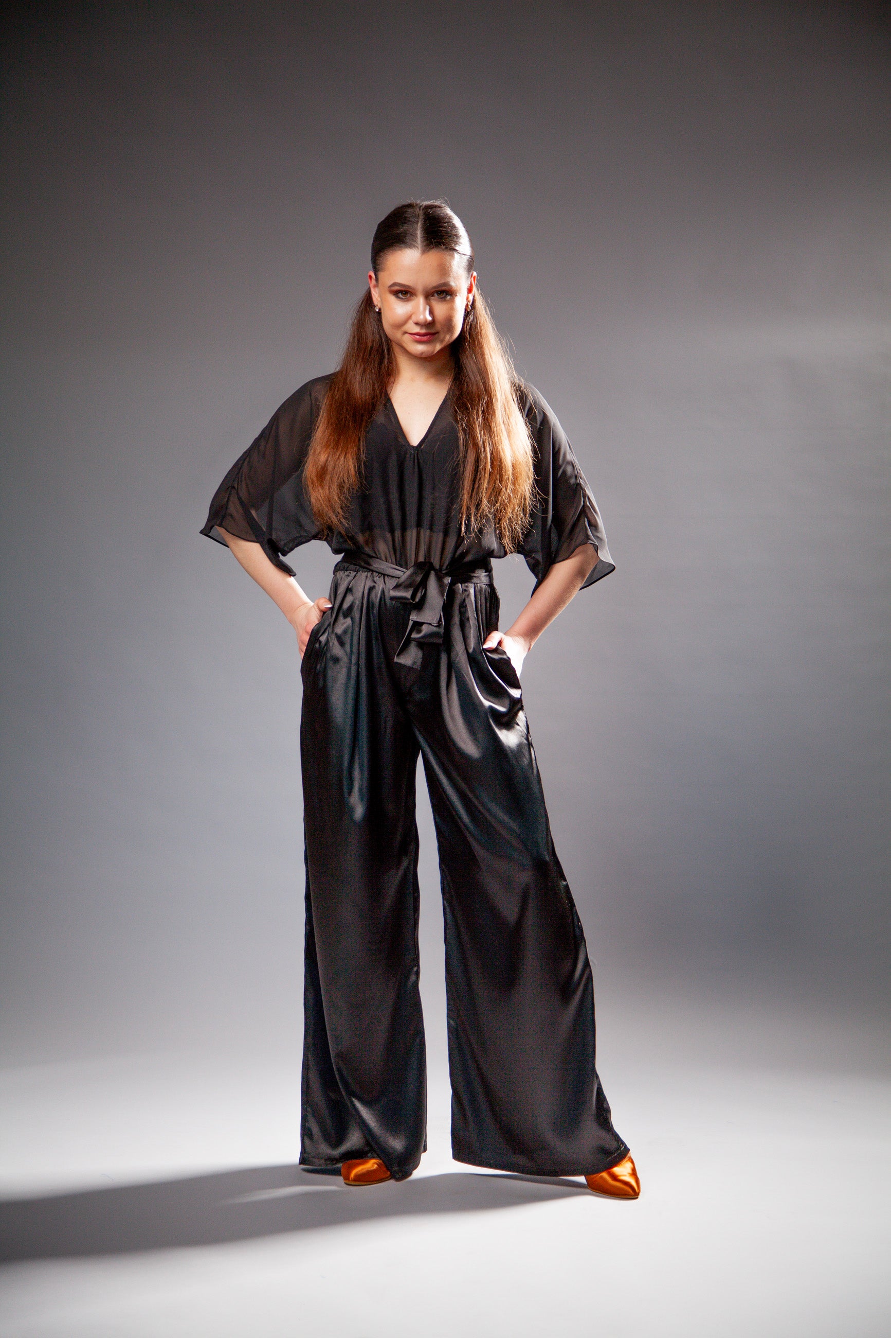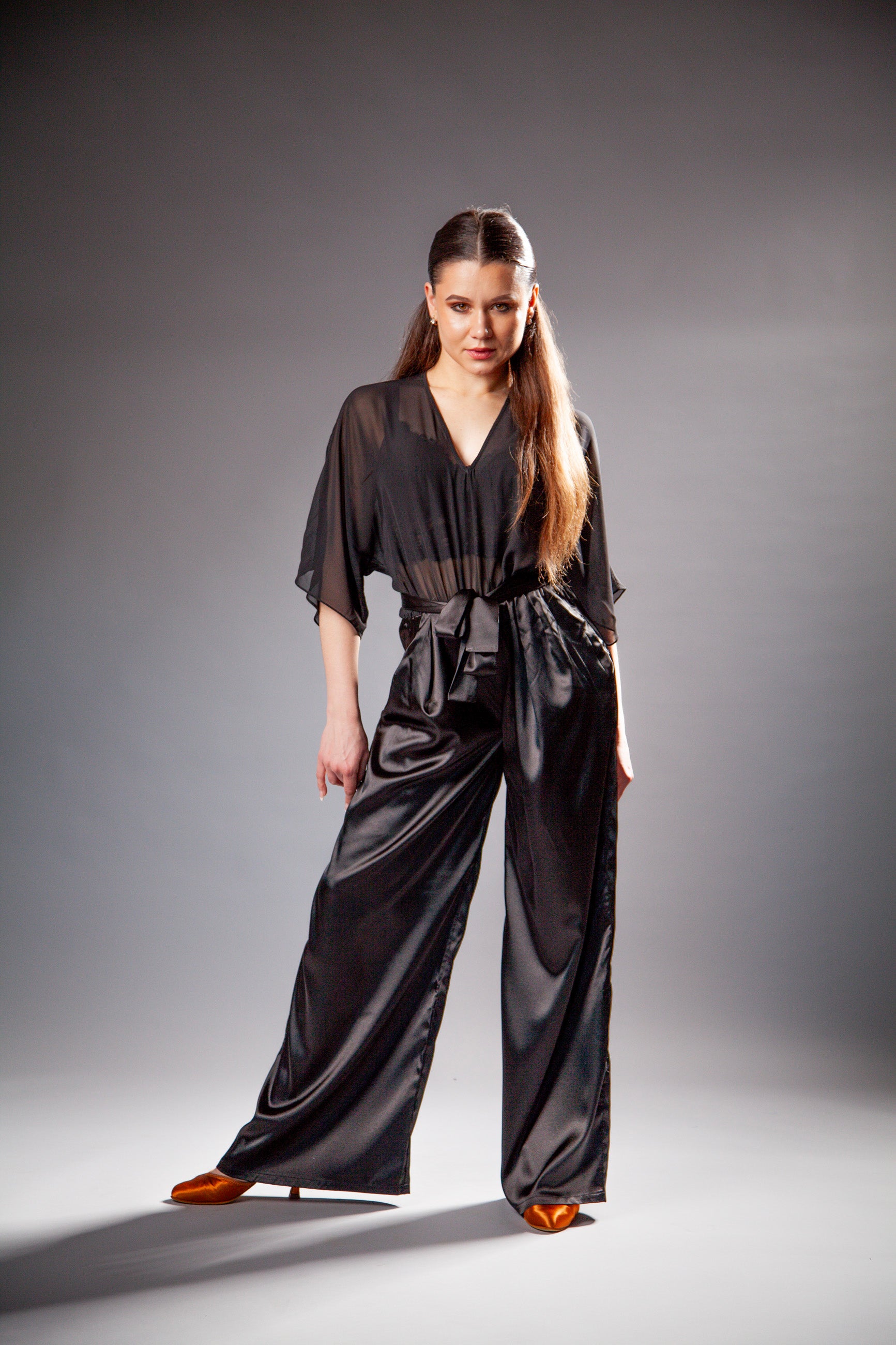 Attractive with it's simplicity in design, yet sophisticated with the glossy-like fabric, this jumpsuit is great not only to serve as practice wear, but also as a competition wear for coaches.