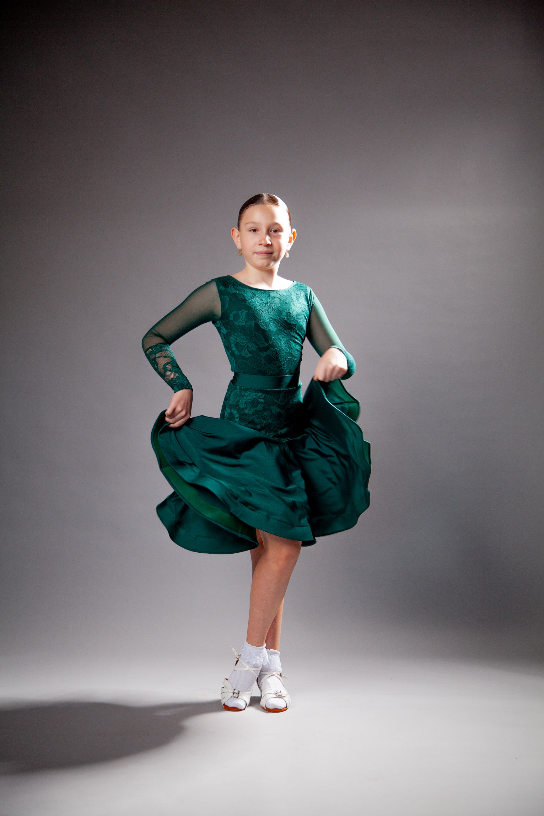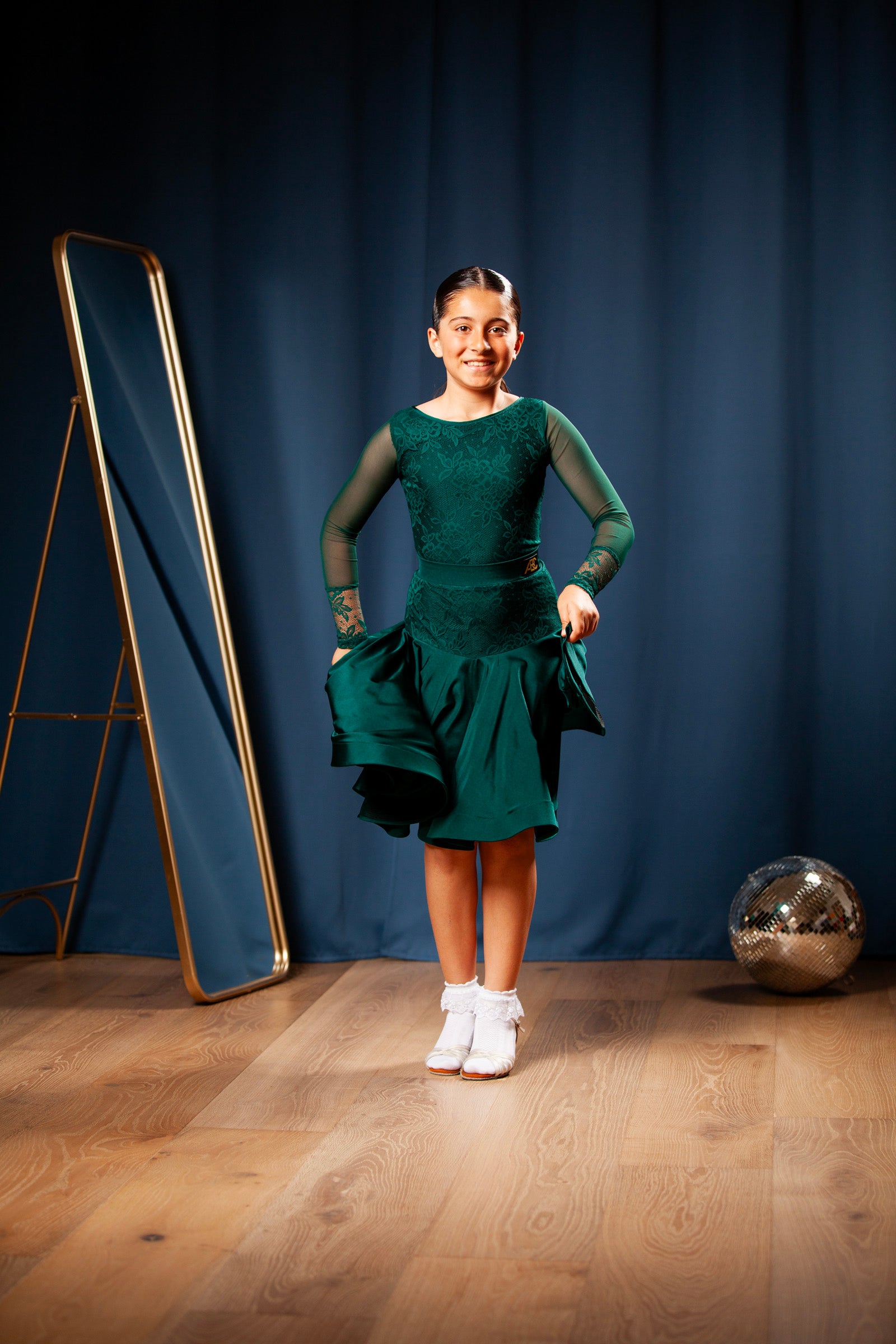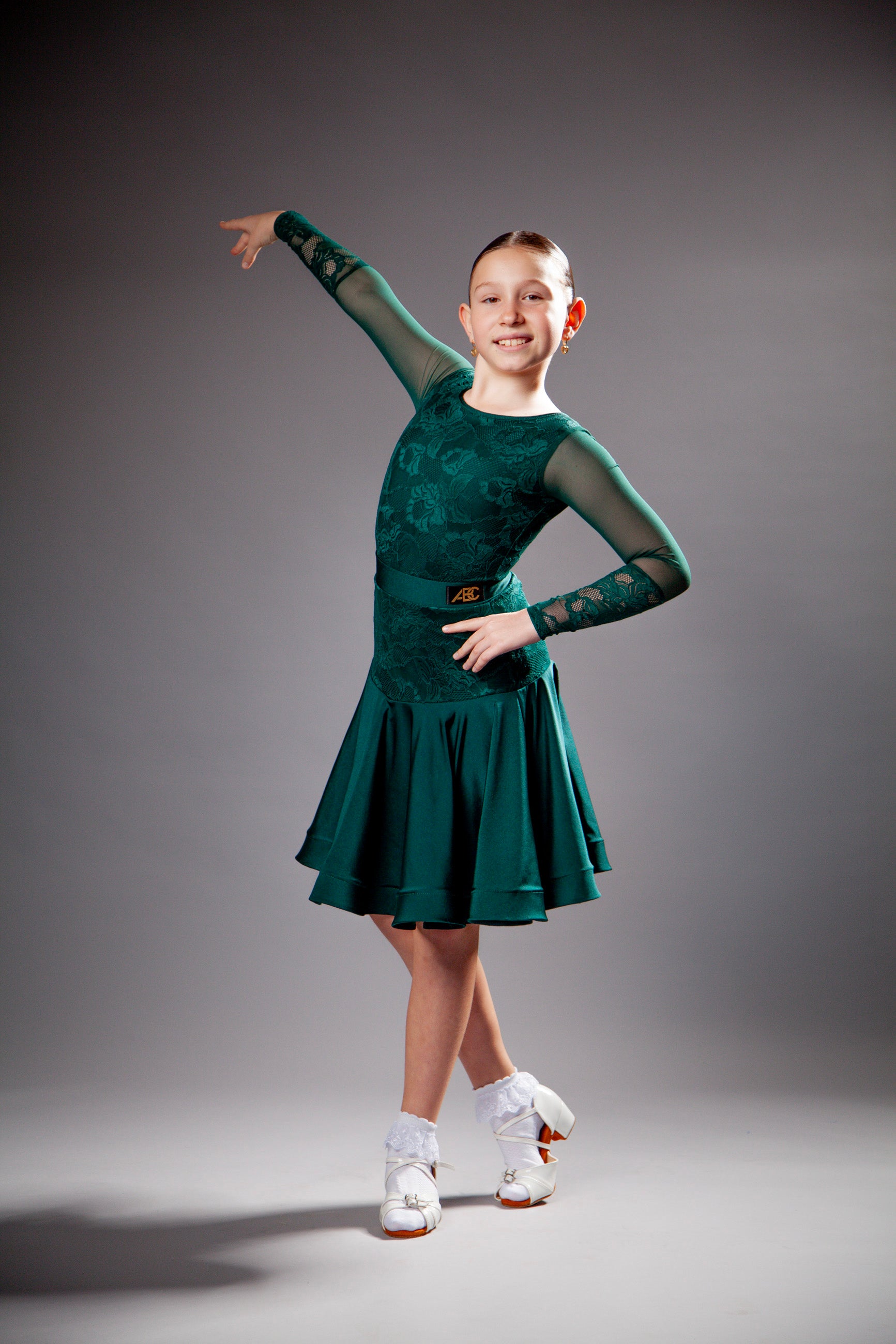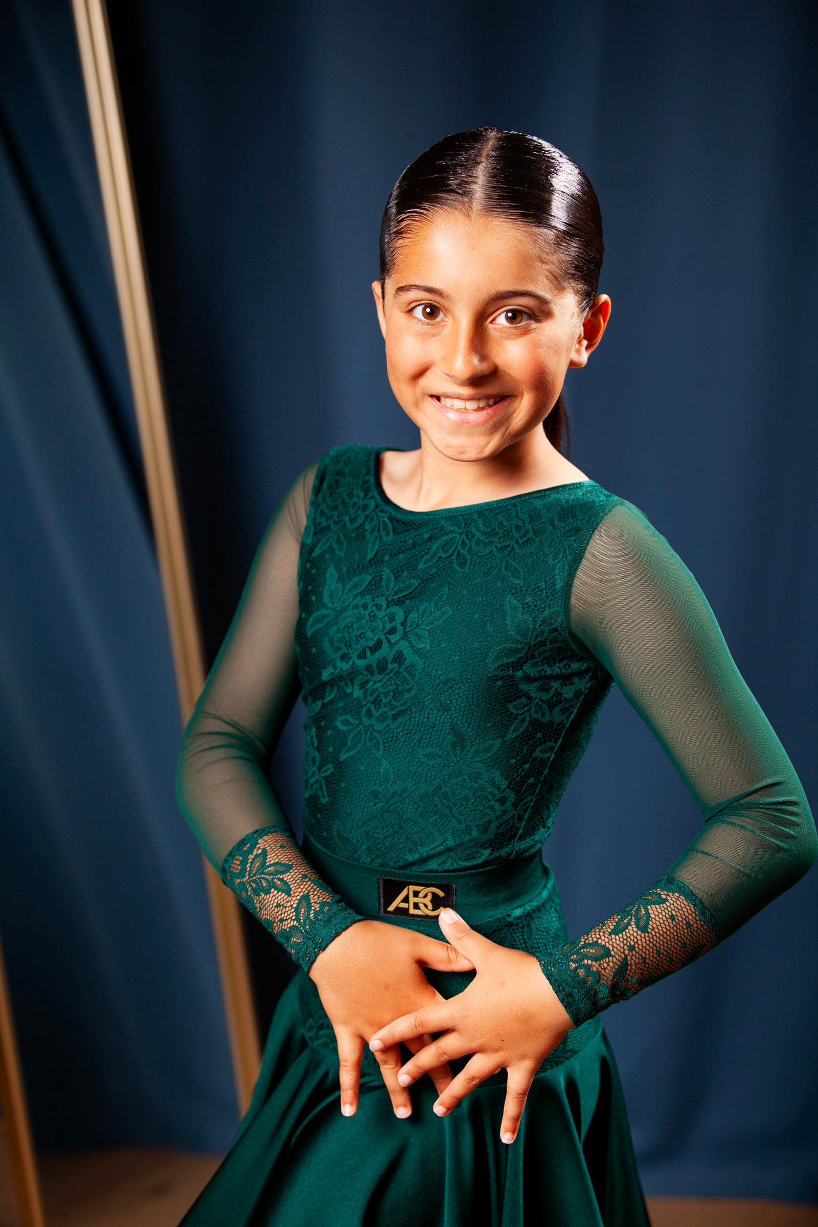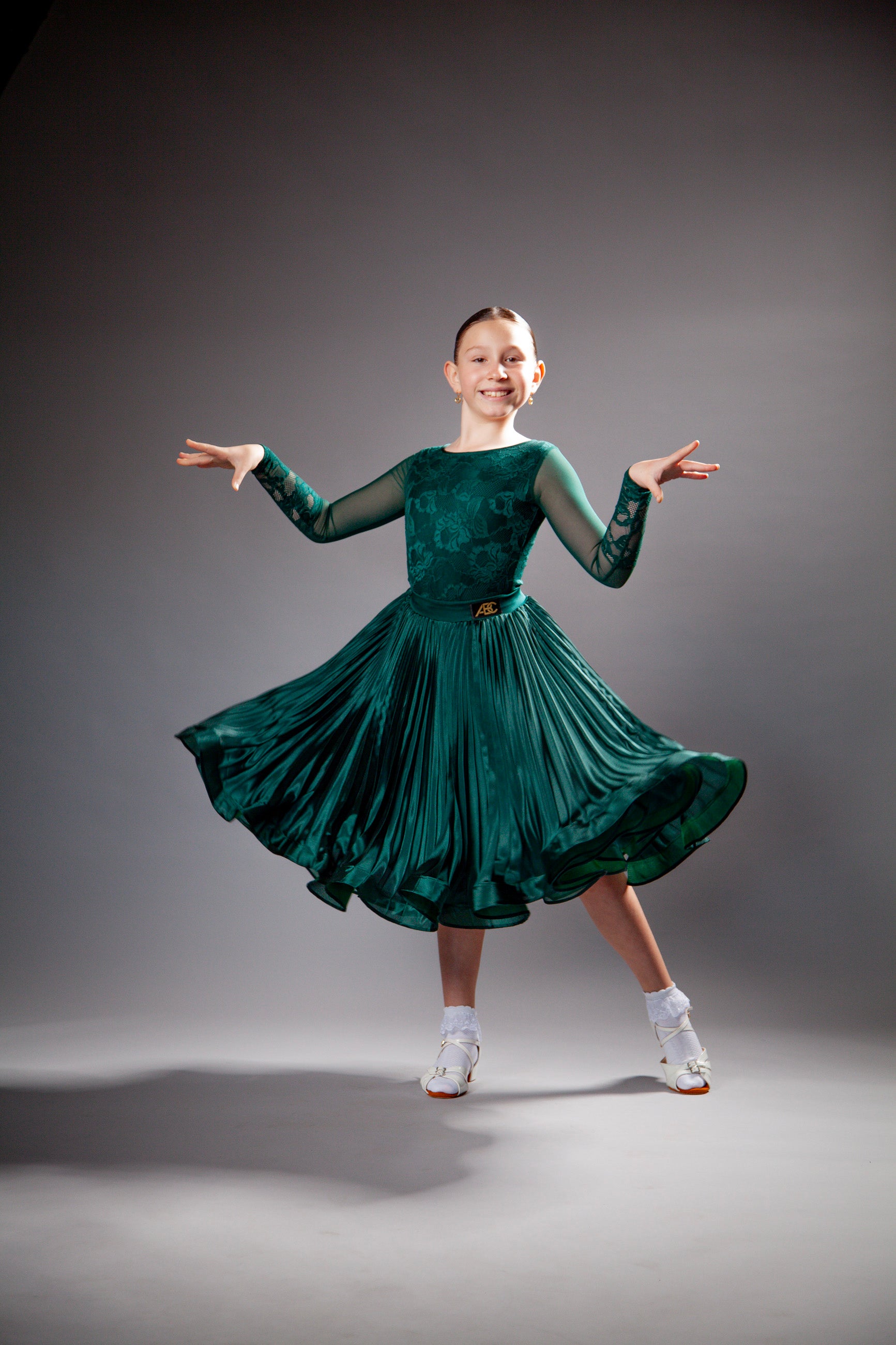 This was our very first dress style that we created. It was intended for the daughter of the co-owner - Emily. She was 9 years old at that time and had been in ballroom dancing for 2 years. She was the one who inspired the whole idea of establishing a company that would offer premium exclusive dresses for ballroom and latin dance in the US market.