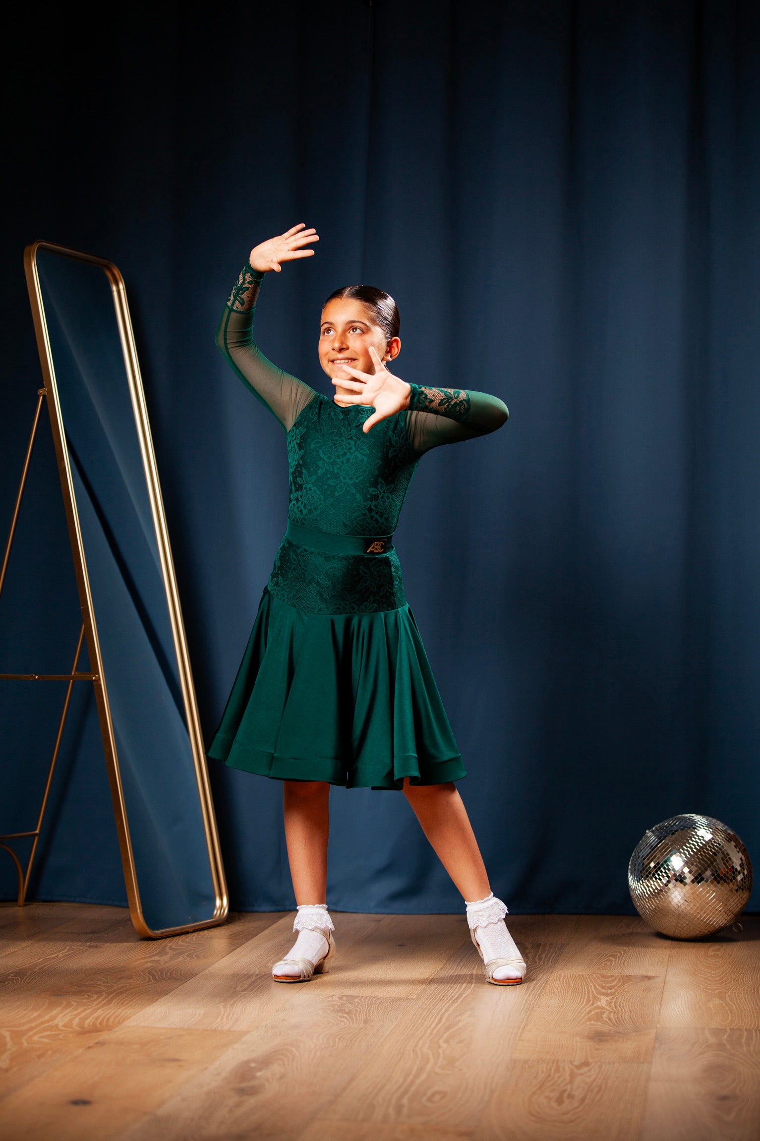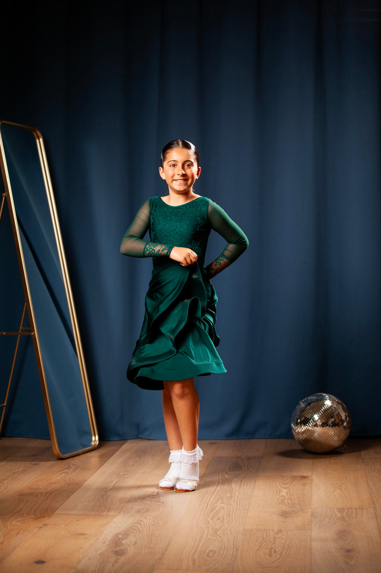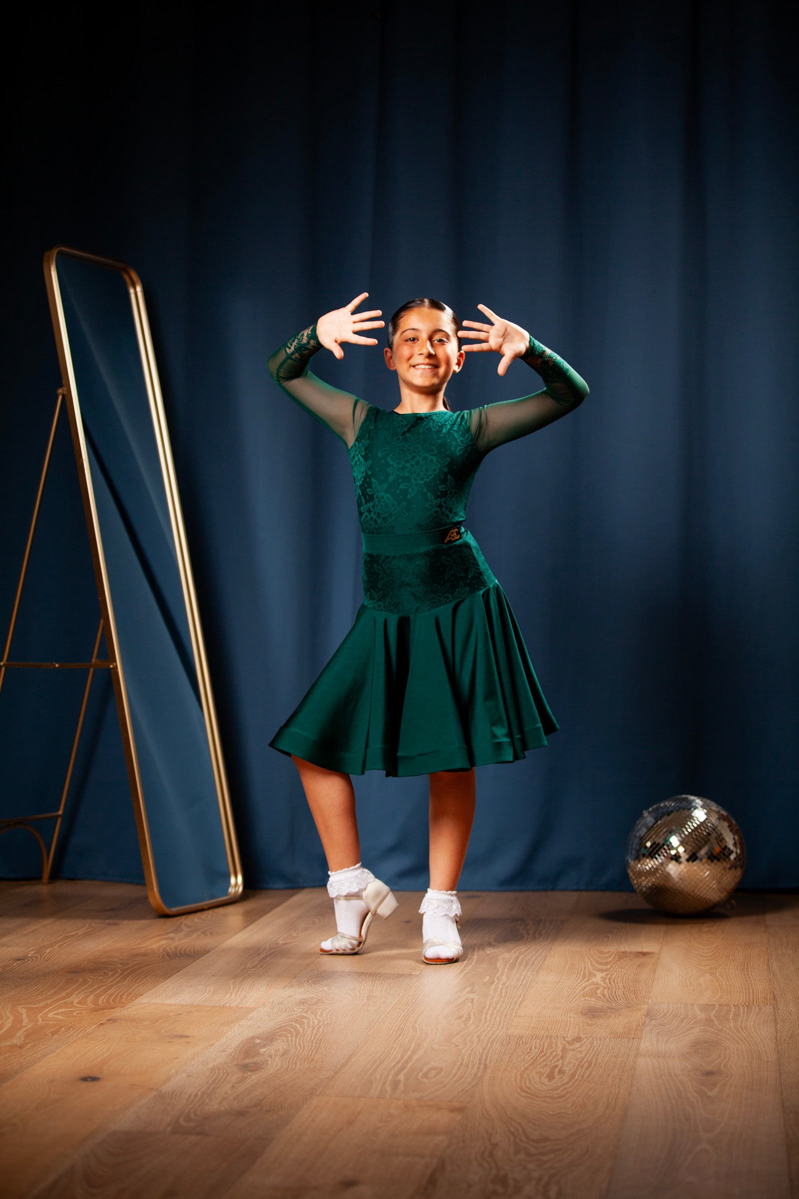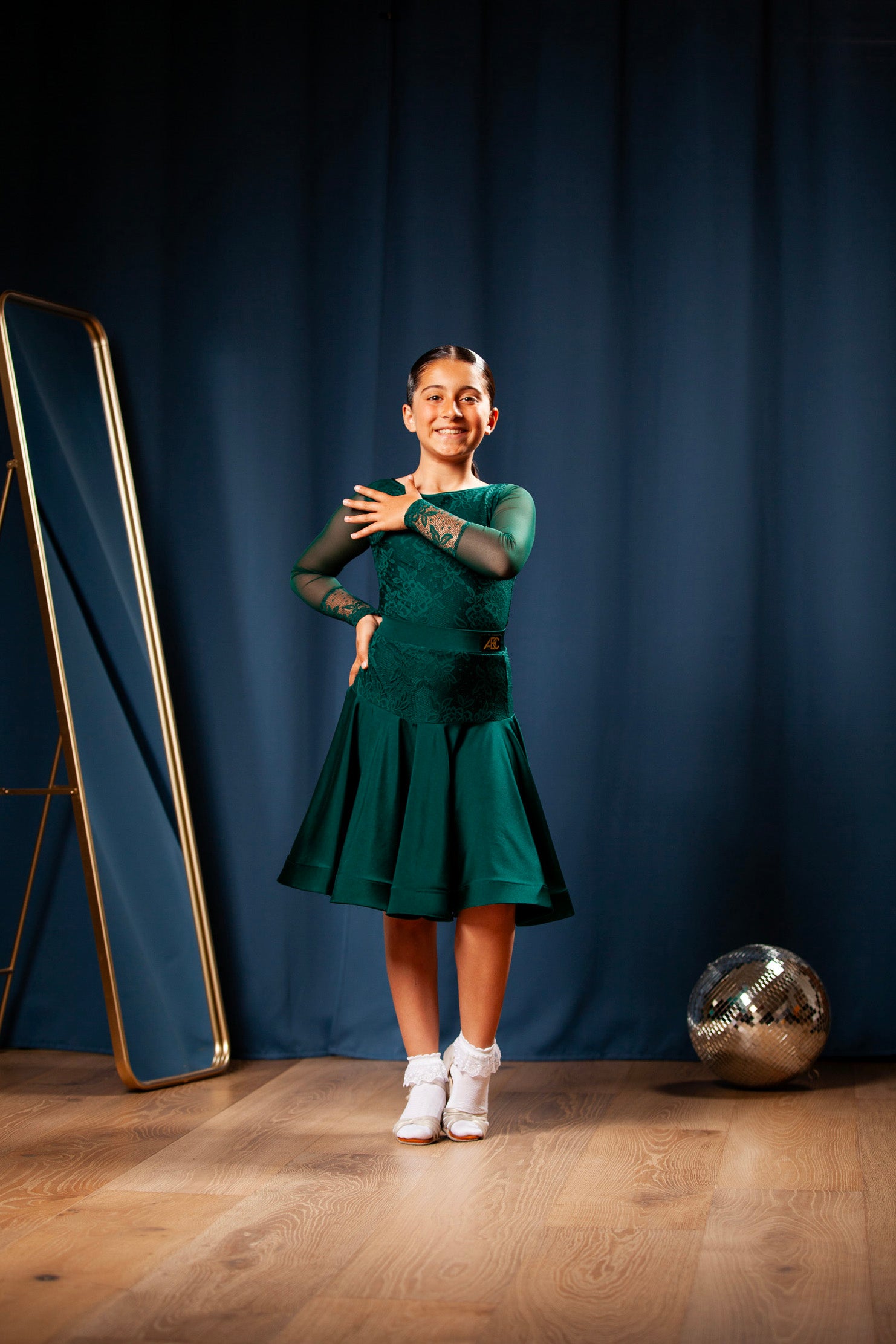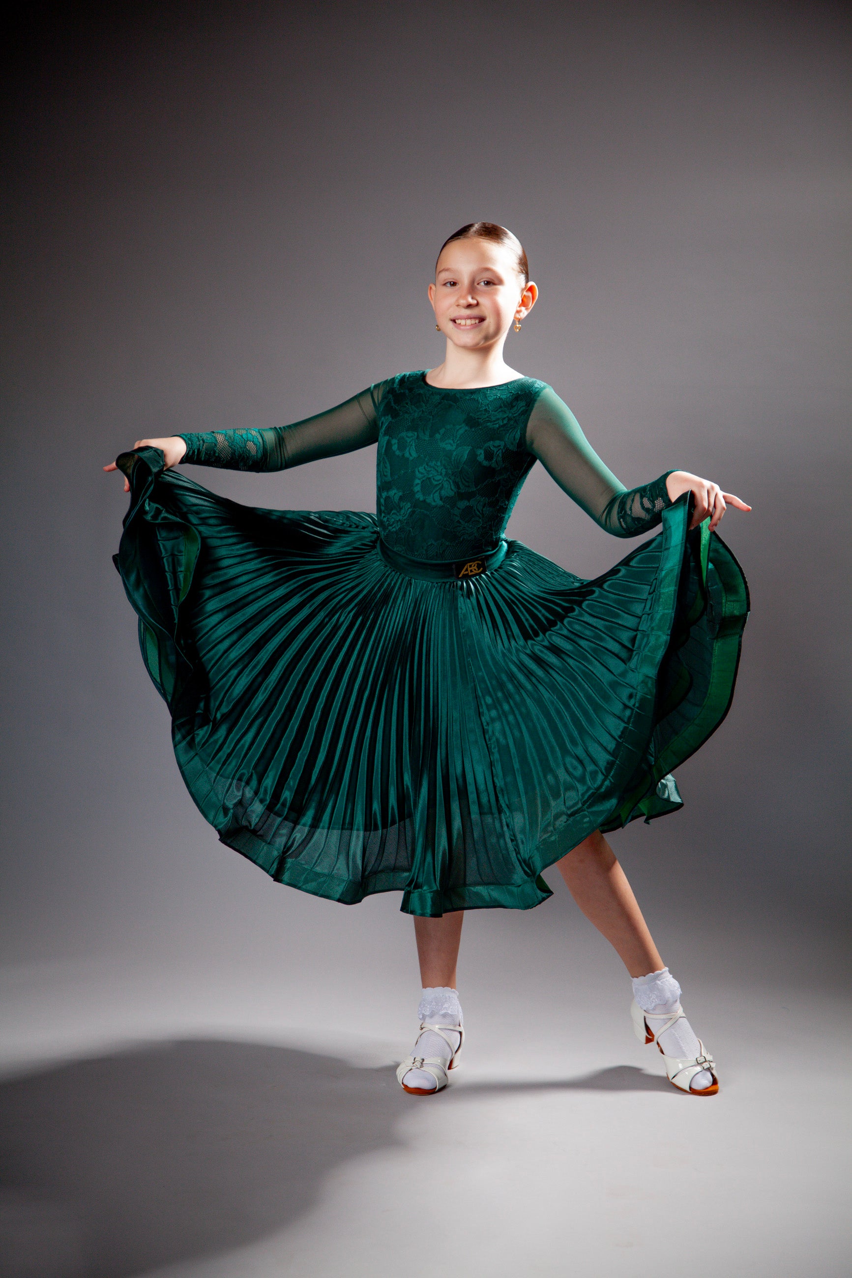 This was our very first dress style that we created. It was intended for the daughter of the co-owner - Emily. She was 9 years old at that time and had been in ballroom dancing for 2 years. She was the one who inspired the whole idea of establishing a company that would offer premium exclusive dresses for ballroom and latin dance in the US market.