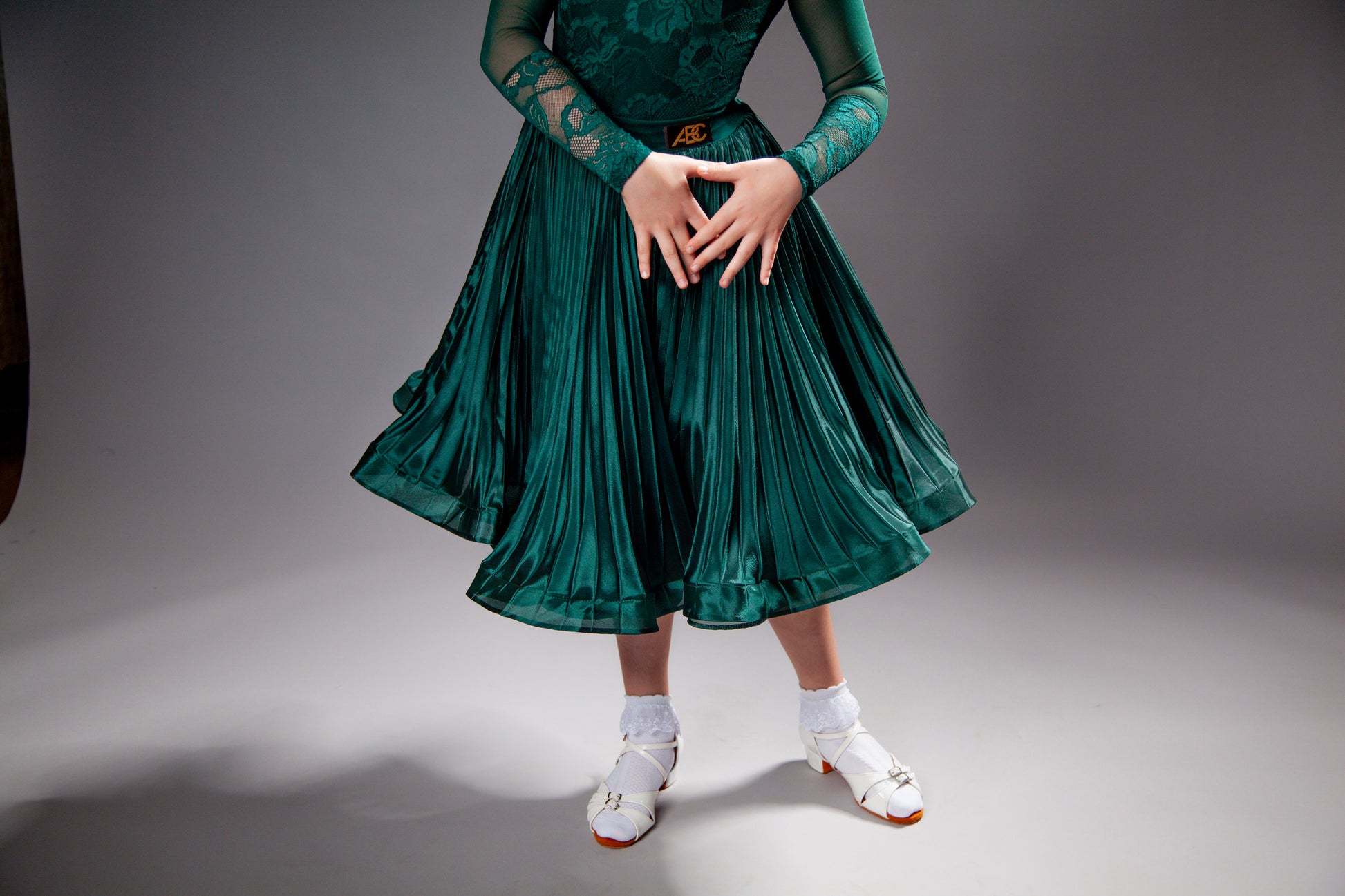 - pleated skirt for ballroom dance with hidden crinoline hem, and organza underskirt that adds volume and flying effect to the skirt