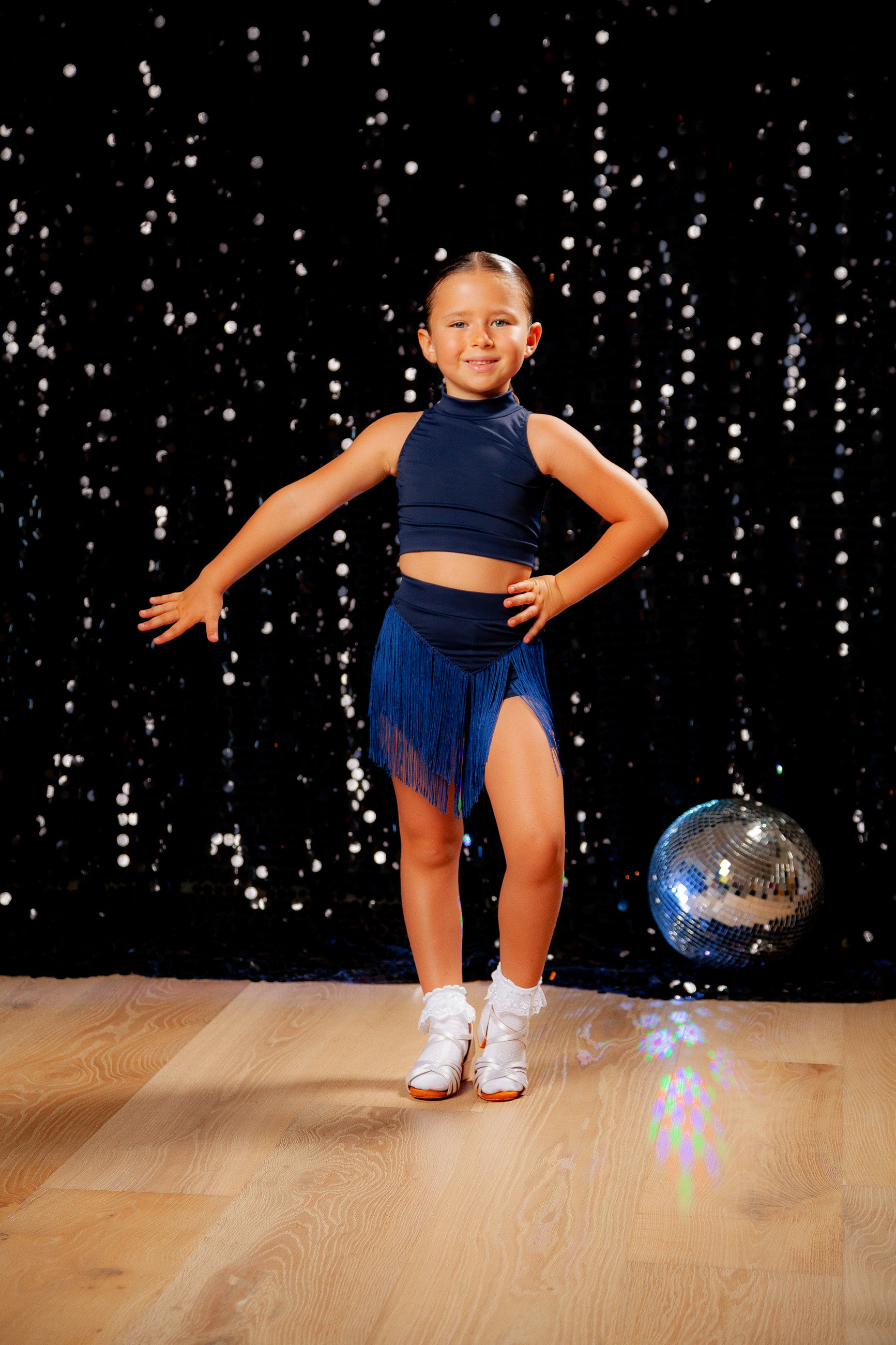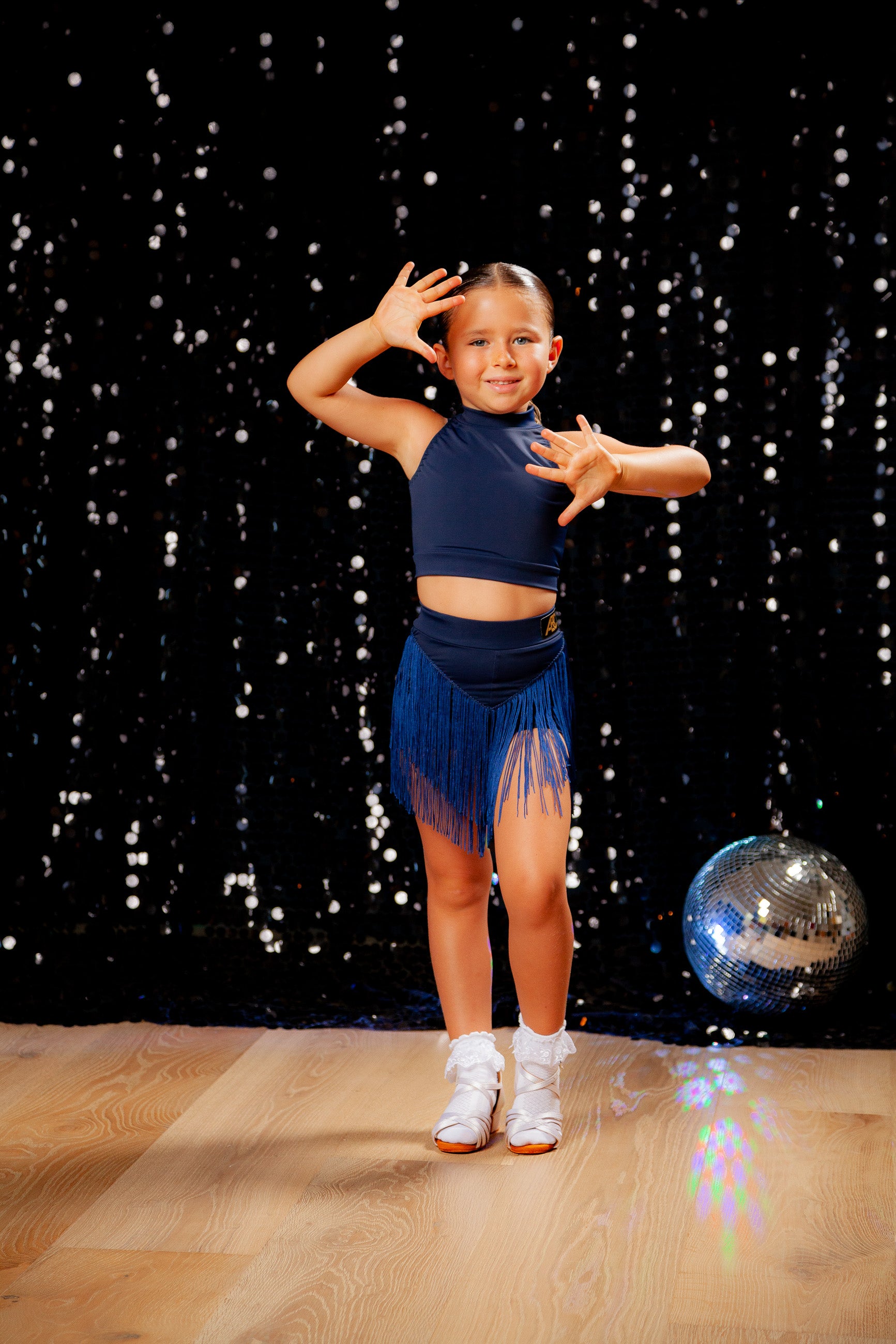 Another version of our signature latin dance practice wear for kids. It is shown in size X-Small for little kids, but it can be made to order for any age. Made in ABC brand colors - navy base with navy accents. Shorts with fringe and crossed navy color stripes on the back. Cropped top accented with crossed navy color stripes on the back