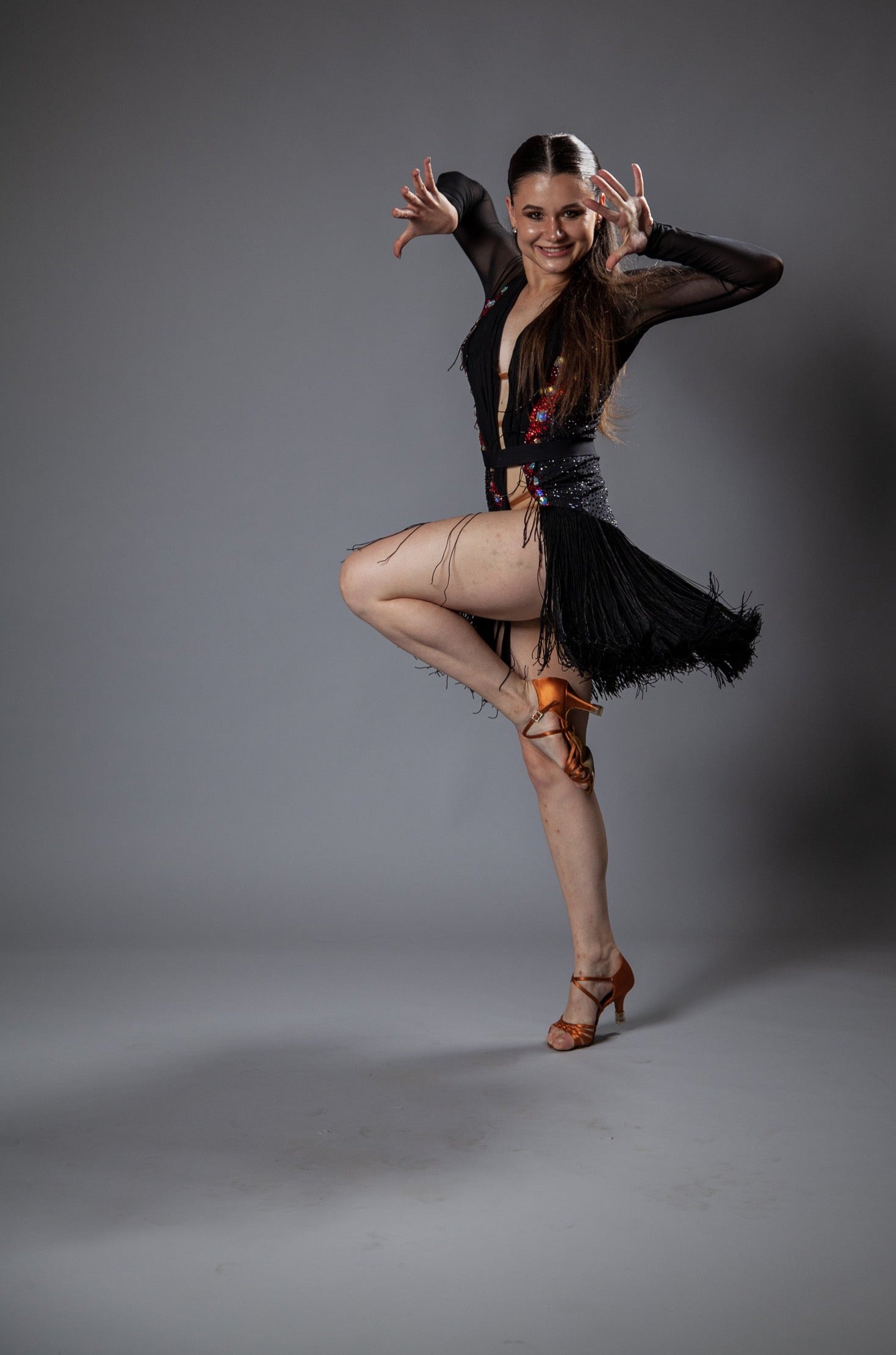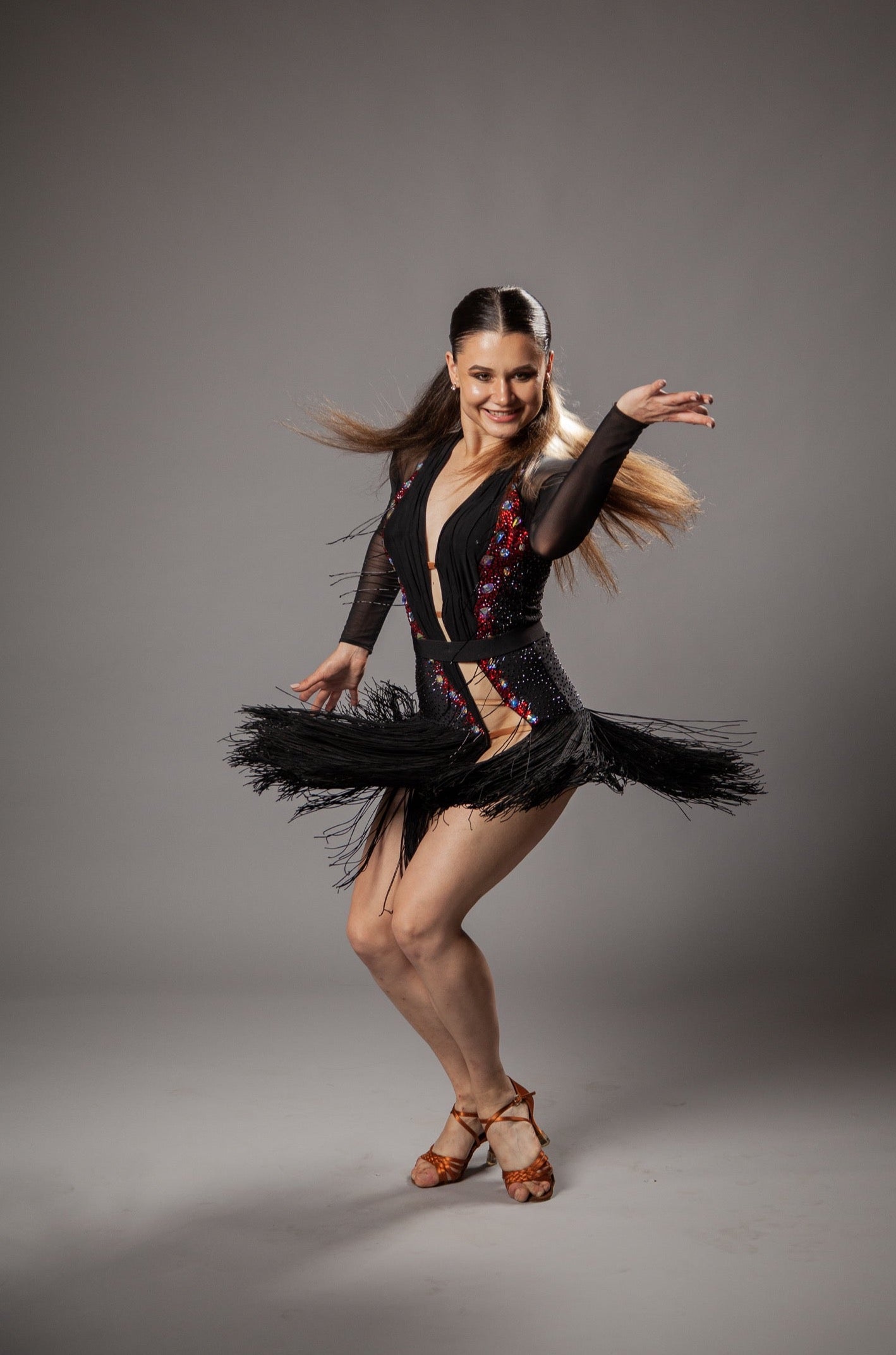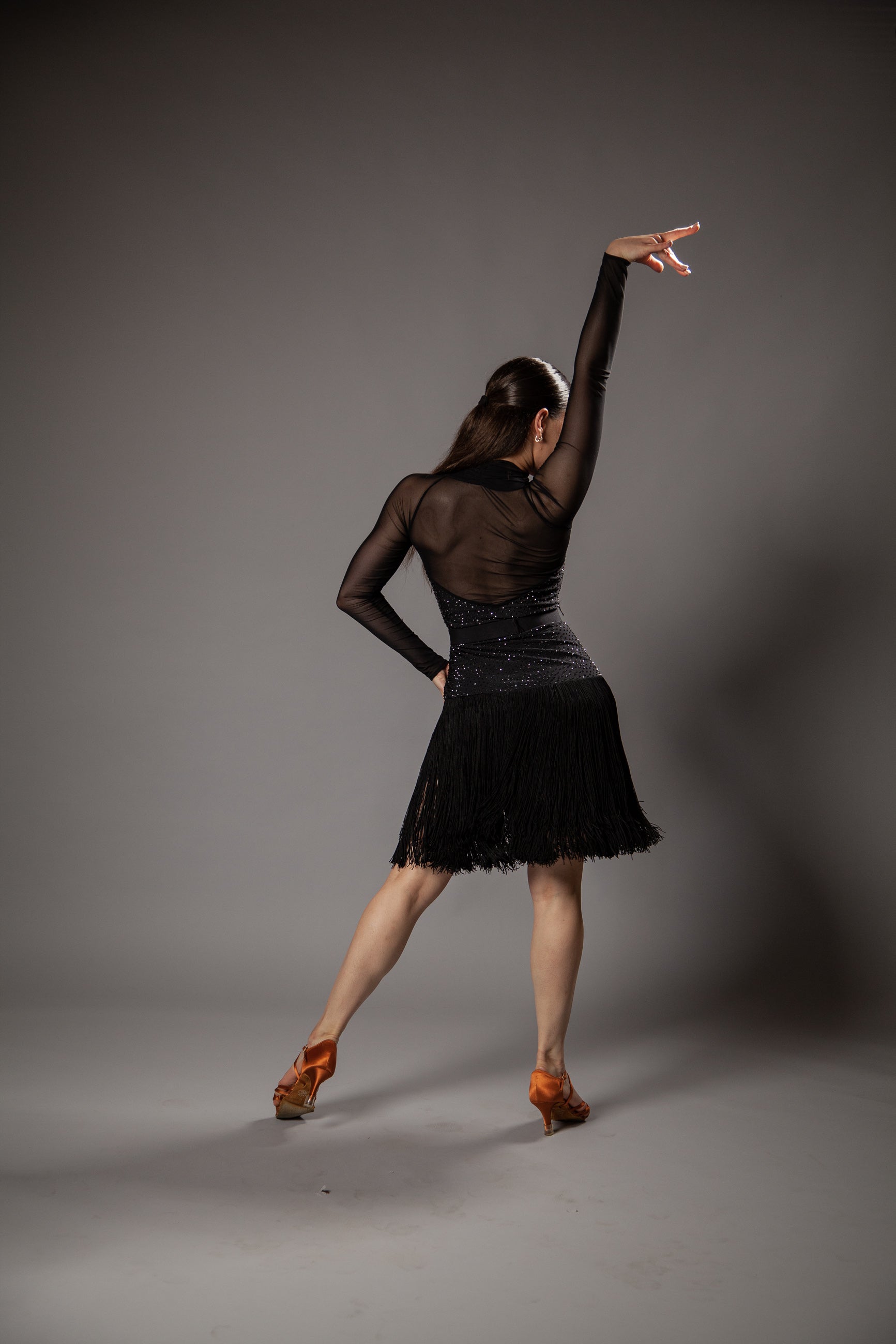 Lady's black with red and silver rhinestones latin dance dress in size Small.