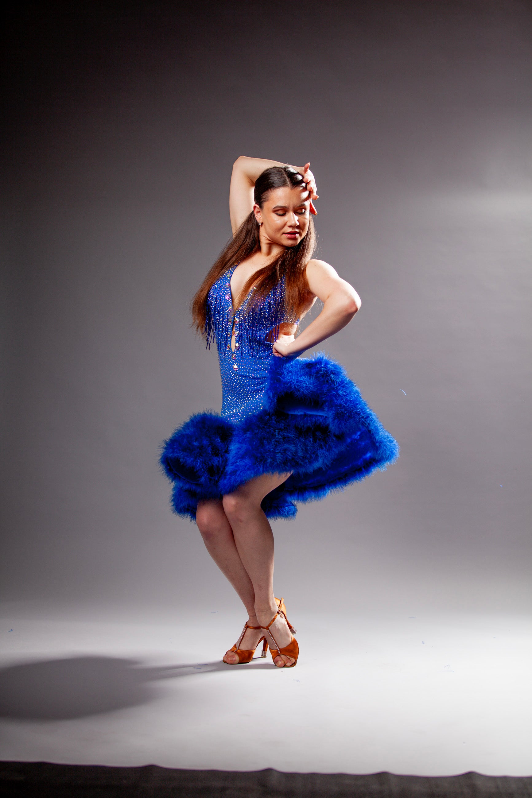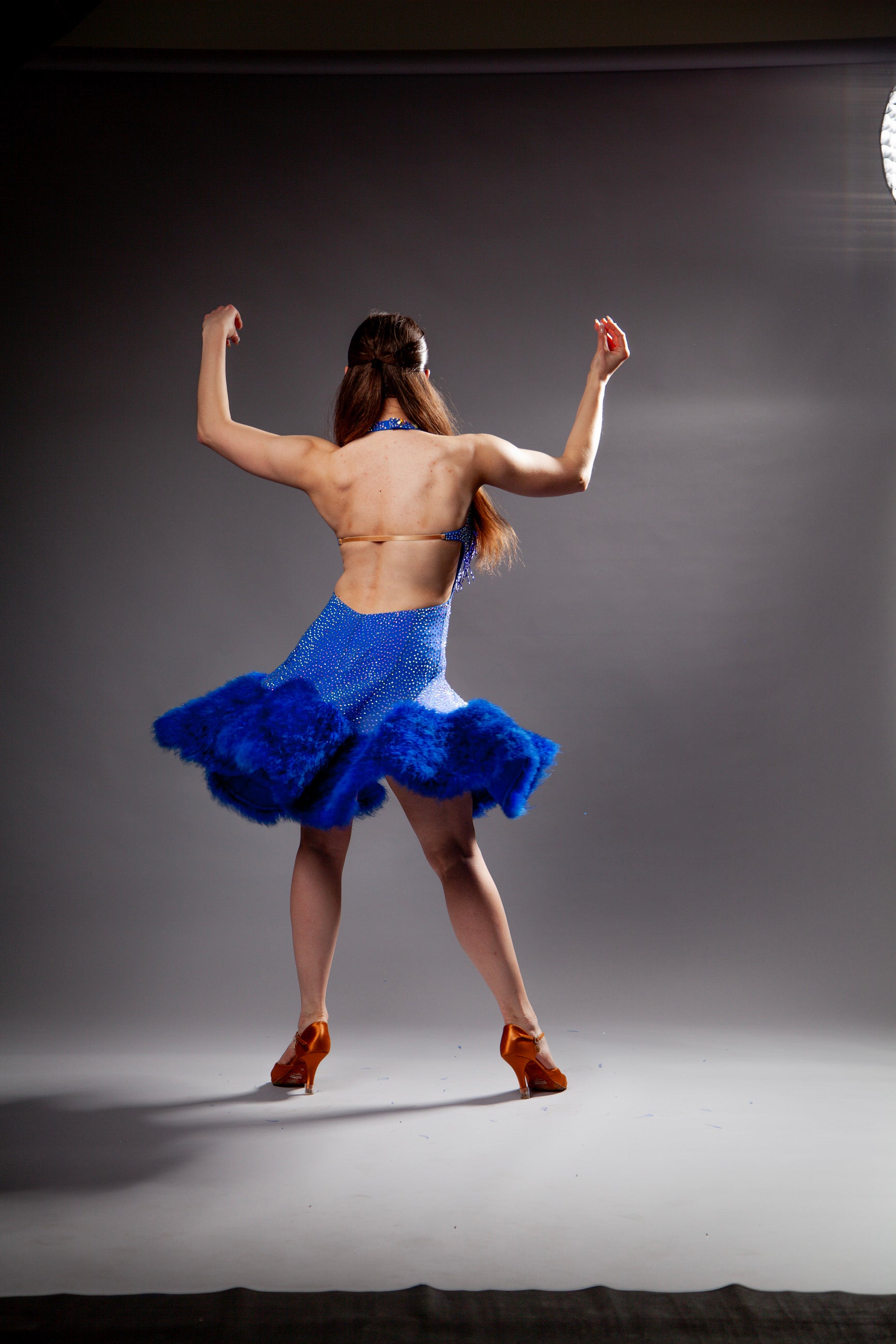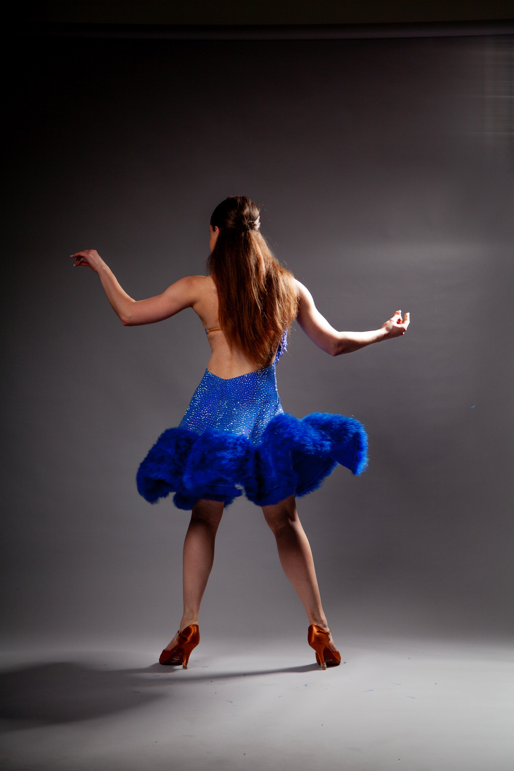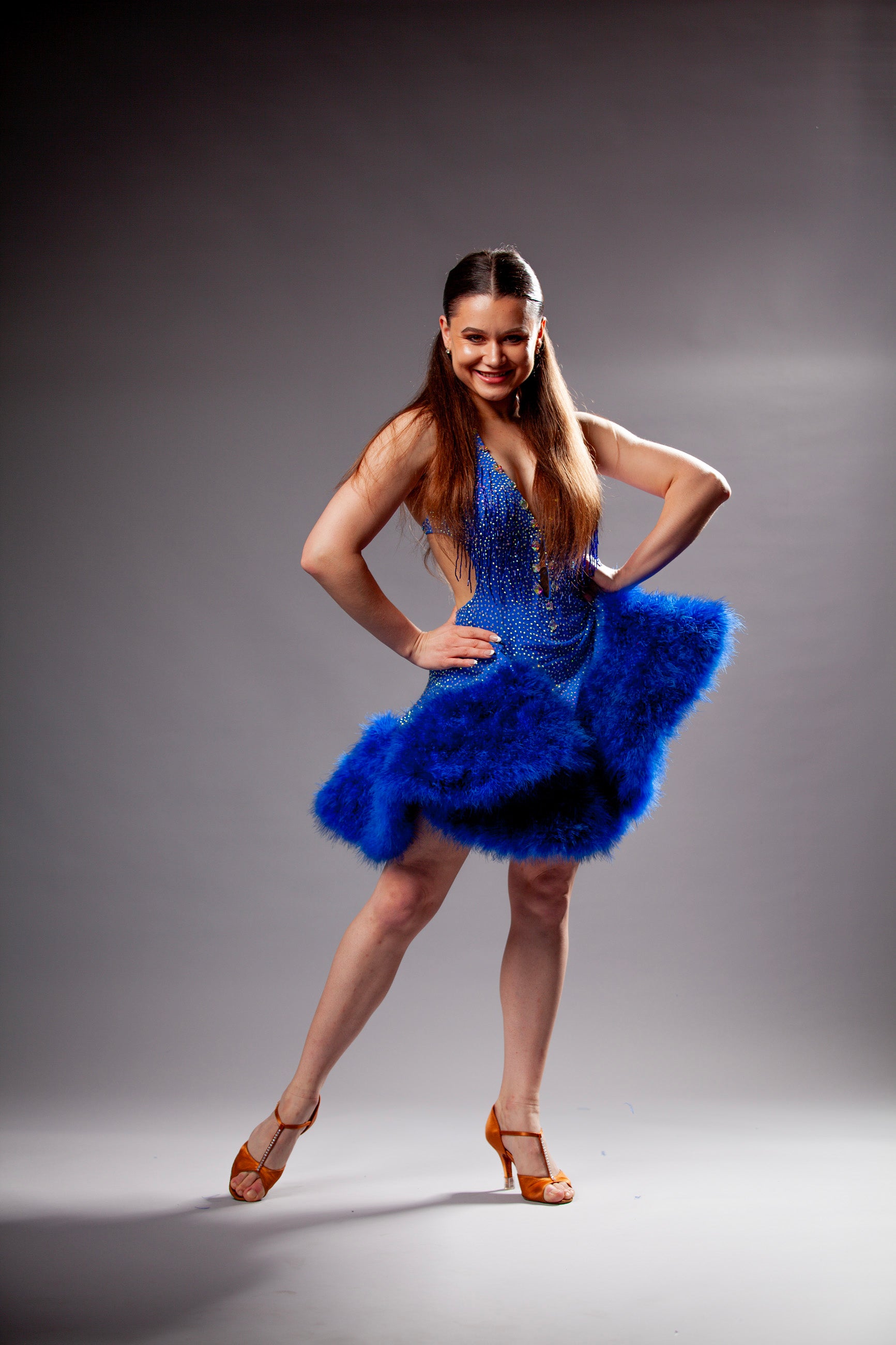 Lady's blue latin dance dress in size Small. Price per rental event. Rental period - up to 5 days. Call us at (949) 550-4343 or email us if you want to rent this dress