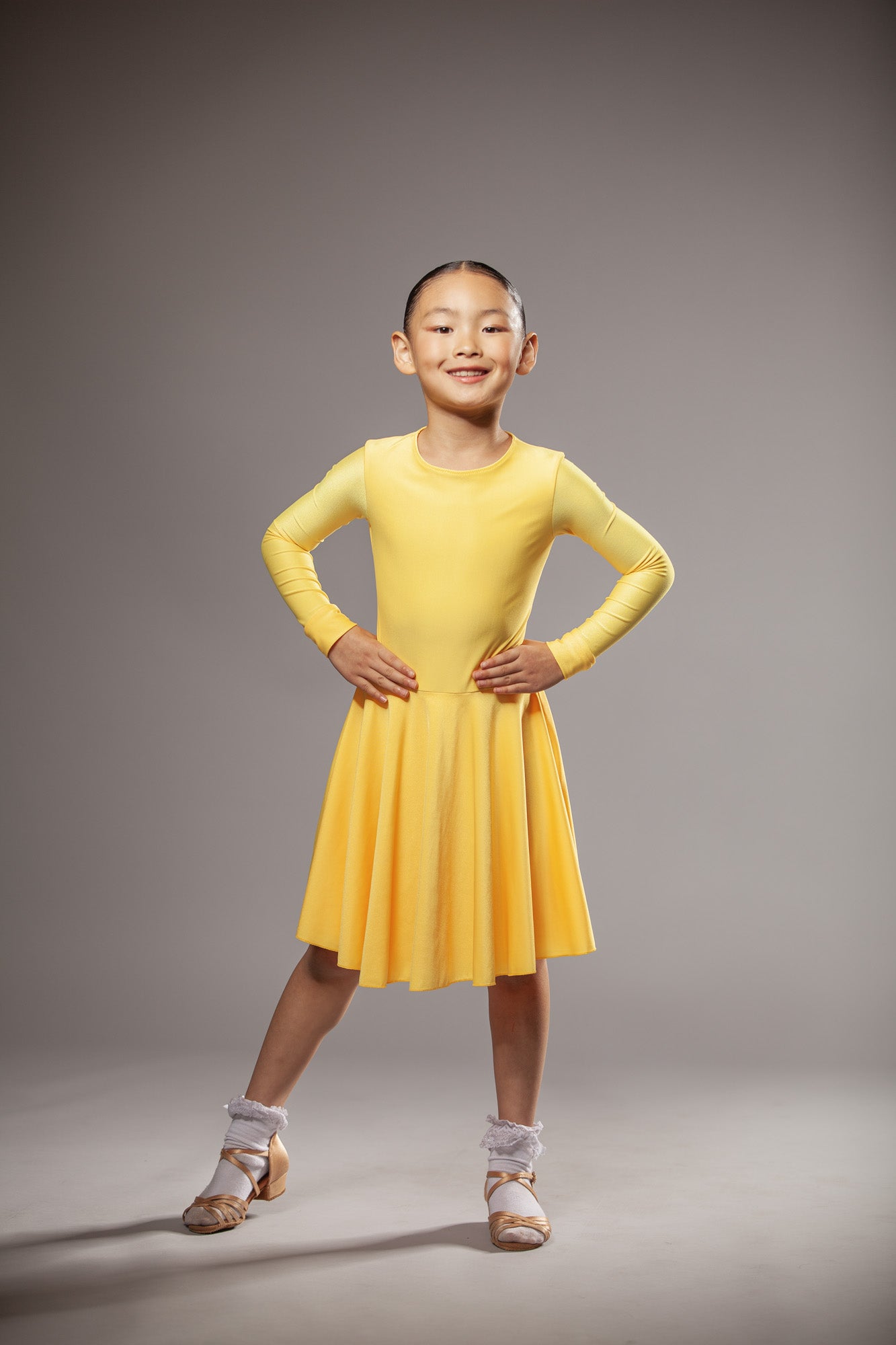 Yellow lycra dress designed to fit girls from X-Small to Small size. Bright color will make your daughter stand out on the dance floor.
