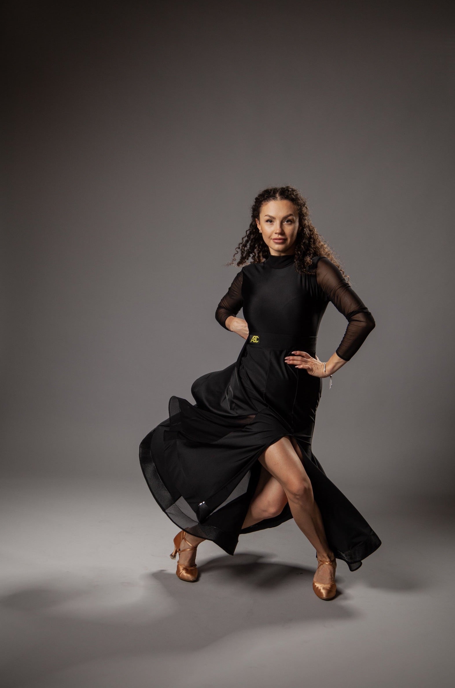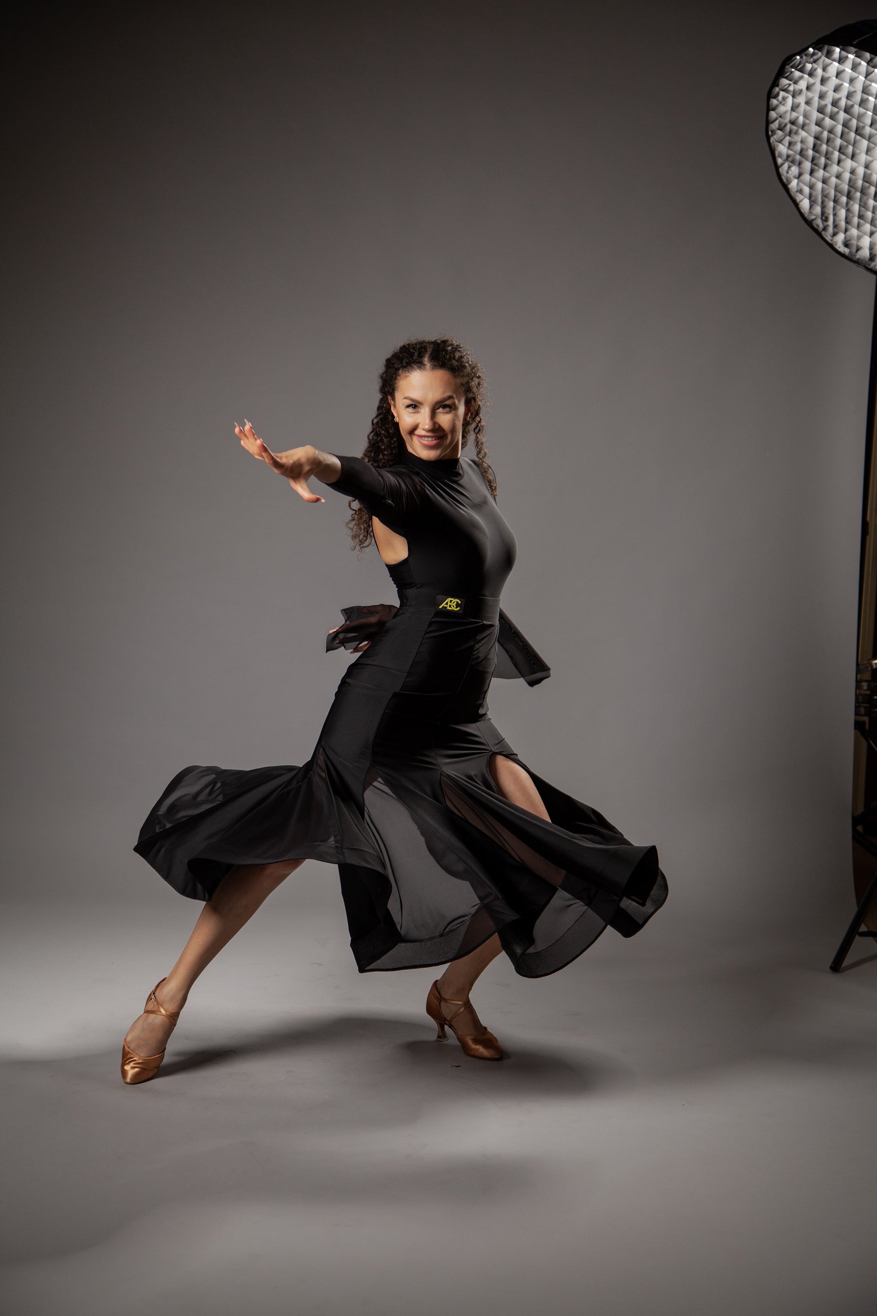 Elegant set for smooth dance practice! Leotard with fine net long sleeves and a lightweight scarf attached behind the left shoulder. Comfortable long skirt with net inserts. It's' a great choice for International Standard and American Smooth dance practice. It can be purchased as a set of leotard and a skirt, or separately.